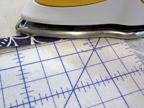 - Following manufacturer’s instructions, fuse the interfacing to the wrong side of each tie strip, making sure the edges of the layers are flush on all sides.