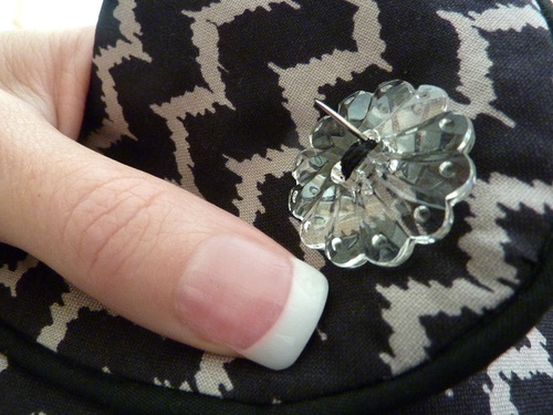 - Find the pocket. Place it back into position over the appliqué and pin along the sides and around the bottom.