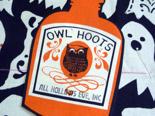 - Set the appliqué on the front skirt overlay panel in between the the pocket marks. On our sample, the owl at the center of the bottle needed to be just above the pocket line. It will also look more interesting is the bottle is tilted slightly to the right.