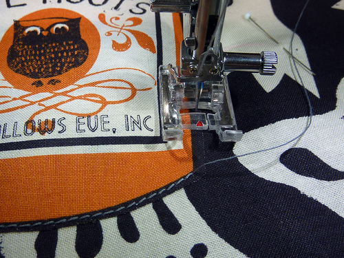 - Lengthen the stitch. We used 2.8mm. Attach a standard presser foot or a Satin Stitch foot (what we used). Edgestitch the appliqué in place.