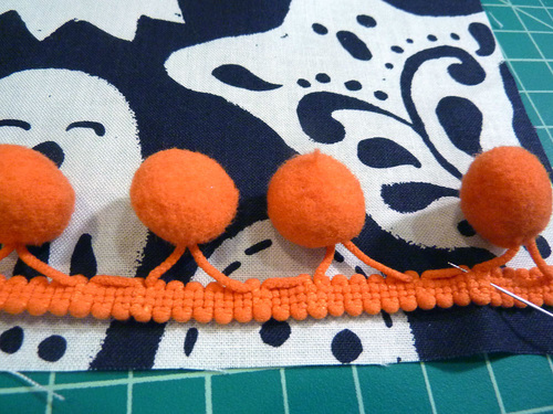 - Using a Zipper foot, machine baste the pom trim in place.
