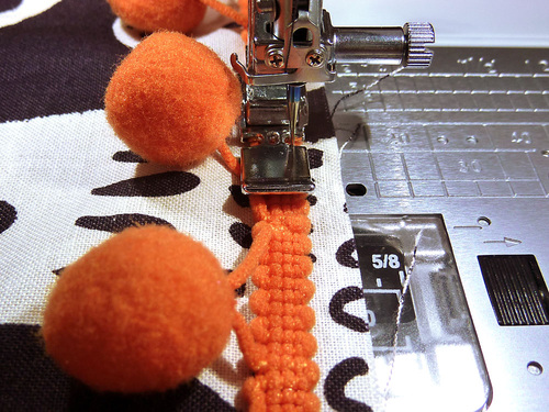 NOTE: You can use a different foot, such as your standard presser foot. We liked the width of the Zipper foot for holding the pom strip in place.