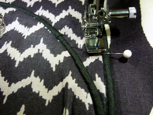 NOTE: If you are new to working with piping, take a look at our full tutorial for finishing details. - Still using a Zipper foot, machine baste the piping in place.