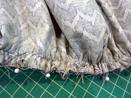 - Gather the top edge of the skirt panel. To do this, run one or two lines of basting across the panels, keeping the the basting within the ½” seam allowance. Remember, don’t lock either end of your seam.