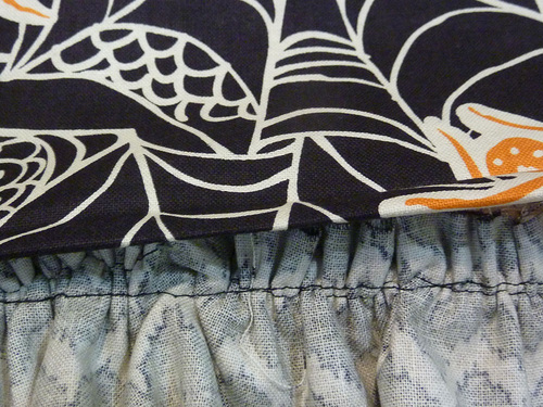 NOTE: Because we were gathering three layers, we re-threaded with the heavy contrasting thread (what we’ve been using for the appliqué stitching) in the top and bobbin. This is optional, but helpful to insure the gathering stitch doesn’t snap. - Pull the basting to gather the skirt to approximately 17″.