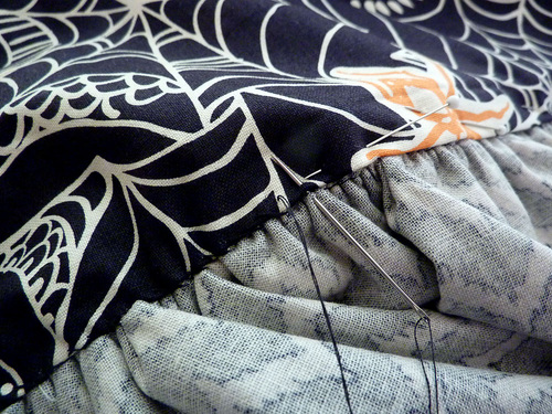 NOTE: If you are new to this technique, take a look at our article: How to Make Gathers by Machine. - Place the piped bottom edge of the bodice front right sides together against the top gathered edge of the skirt panel, aligning the raw edges. Pull the folded bottom edge of the bodice back up and out of the way. Adjust the gathers as needed to fit the skirt against the bodice. Pin in place.