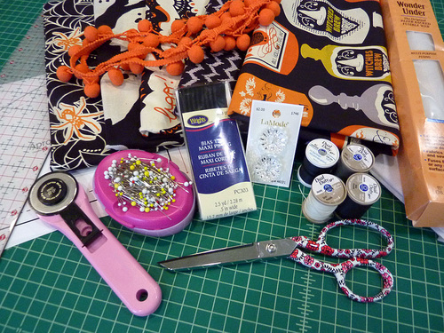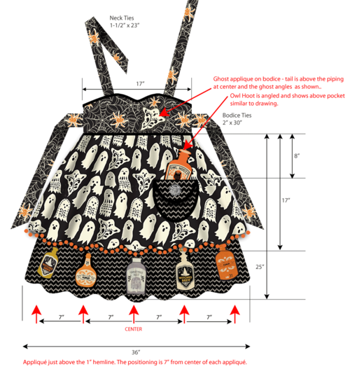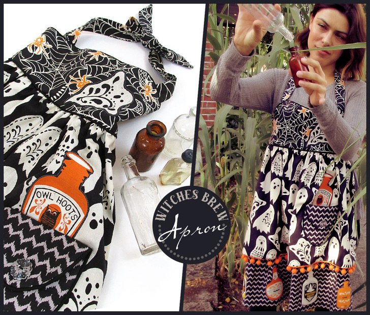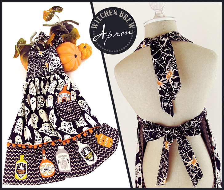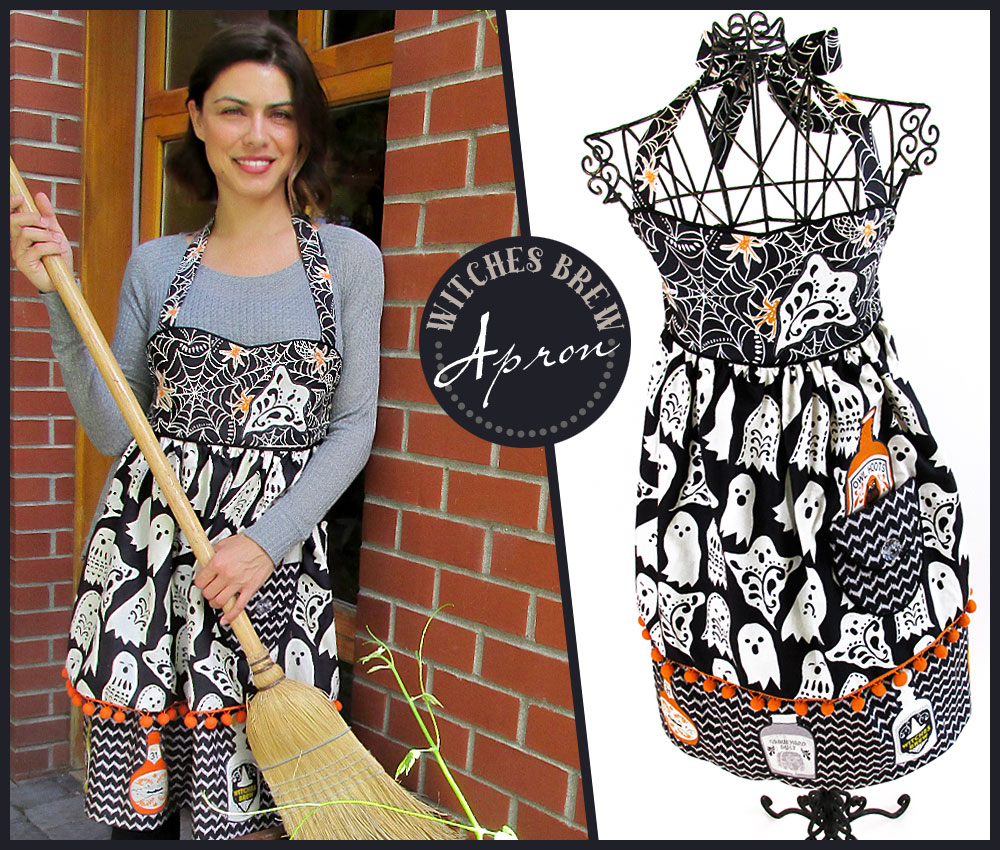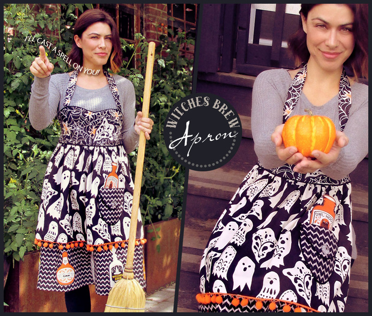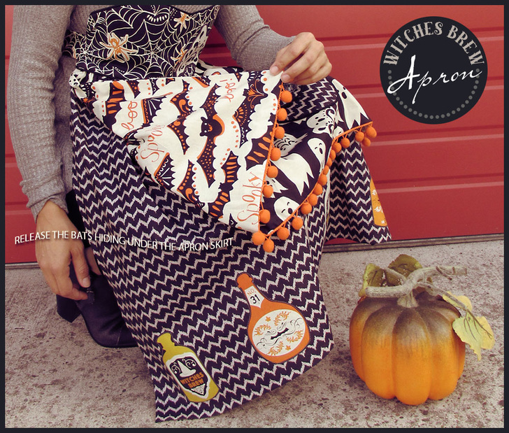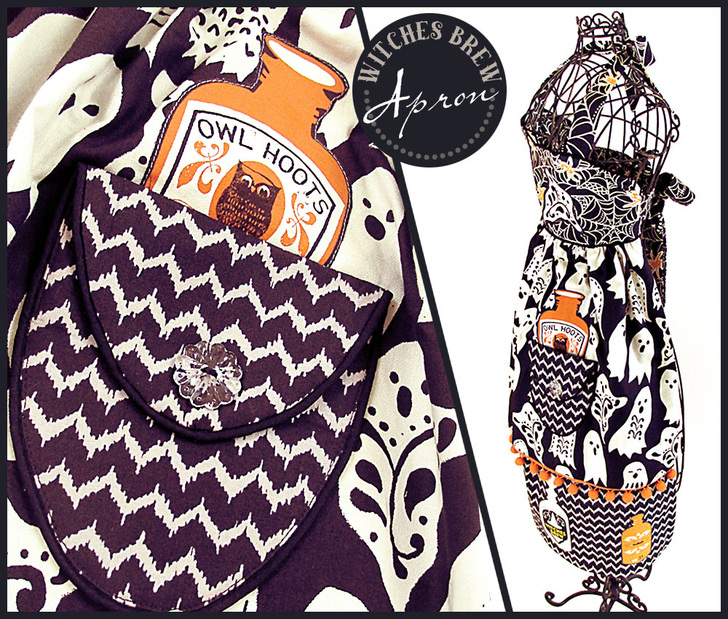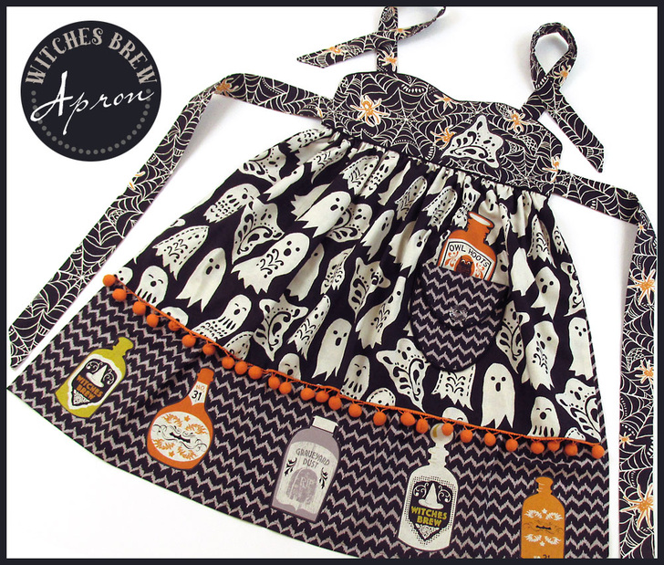 Cast a creative spell over all the little trick-or-treaters with this fashionable Halloween apron. We originally used fabric from the Spooktacular collection by Maude Asbury. Of course, for those of you watching the witchy fashion runways, you know there are always new and varied collections coming out each Halloween from which to choose your favorites.