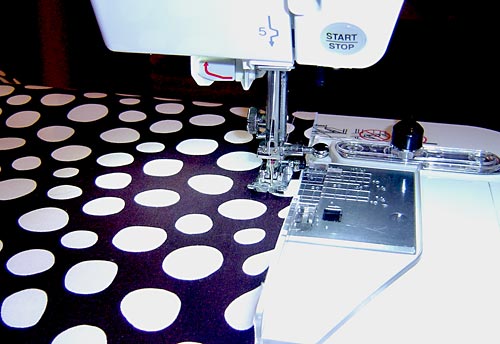 - Stop at the corner. Raise the needle and the pressure foot. Pull the caddy out slightly from under the needle to the left of the machine. You do not need to cut the thread.