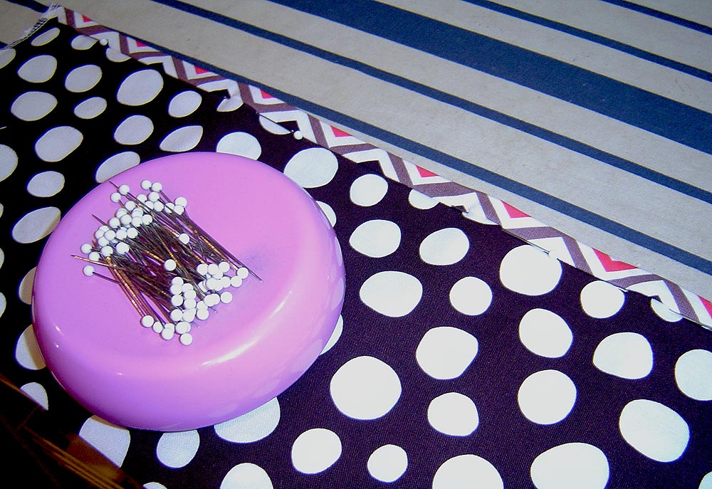 - On the front of each pocket panel, place pins ‘in the ditch’ of the binding seam line, which is right along the seam line of the panel and binding. You will remove the pins as you sew your seam.