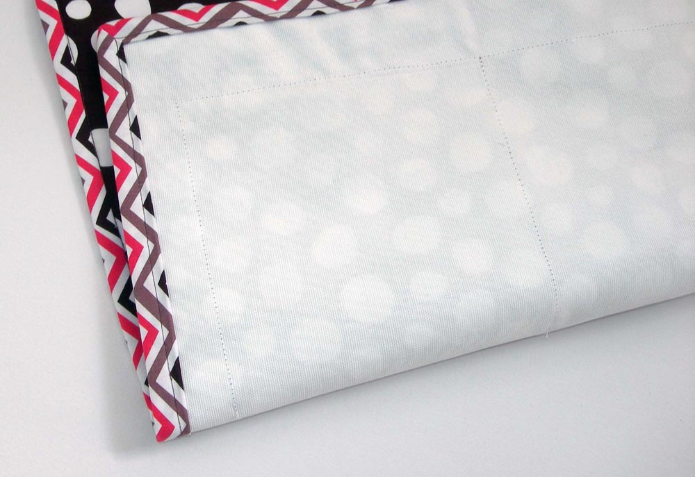 NOTE: Because our project has a definite front and back, we decided to bind the edge in the same manner we bound the pockets. This allows for a clean bound edge on the front with the stitching line only showing on the back. This is different than how we’ve instructed in other tutorials for binding reversible items, such as blankets and throws.