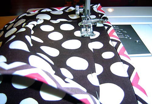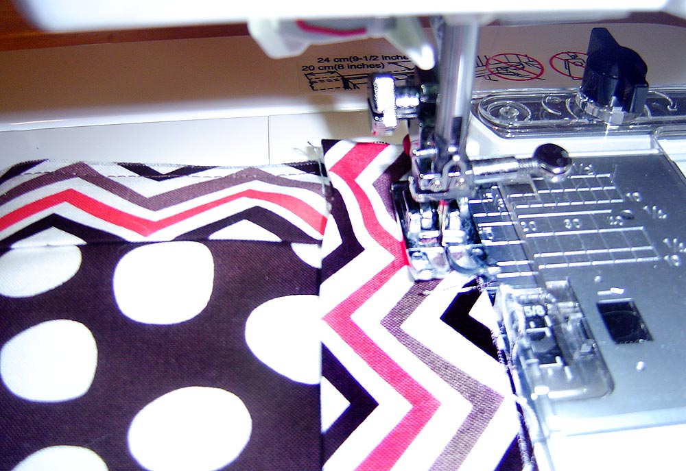 - To sew the pocket sections, start at the bottom line of edgestitching and sew to the top of the pocket along the pressed folds from before. You should also be able to get a glimpse of the marks you made at 6″ and 12″ from the panel’s edge. Use this to align your foot to start. Again, be sure to Back tack at the beginning and end.