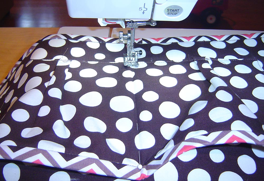 - Using a straight stitch, edgestitch each pocket panel in place. Start to sew at the top of one pocket side, stitch down, pivot at the corner, go along the bottom, pivot at the opposite corner, and go up the other side to finish. Be sure to back tack at the beginning and end of each pocket panel, and be careful to keep all your layers flat when stitching over your pleats.