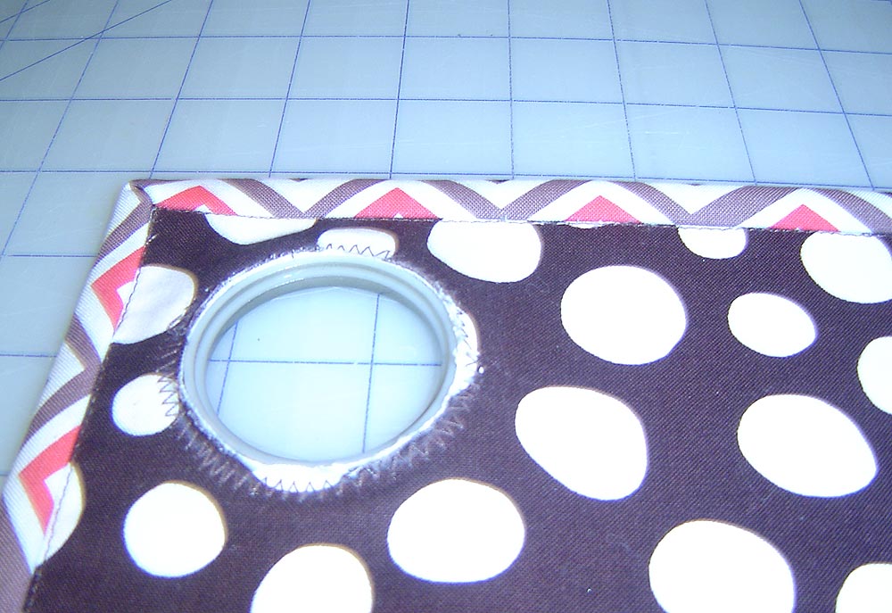 - Using a zigzag stitch, sew around the marked circle for each grommet’s position. We use a zigzag stitch here to help keep the fabric from fraying in case we ever needed to wash our door caddy.