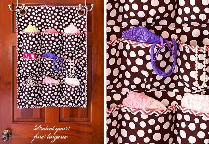 For years I had an “unmentionables drawer.” This had a double-meaning (double entendre for my fancy-schmancy friends): I kept my unmentionables in there (undies and the like), but it was also a drawer I preferred not to mention because it was such a MESS. I was always digging around, looking for something, tossing things about like a giant salad. Yikes! This easy over-the-door, nine-pocket caddy is much better at keeping my fine-wear and lingerie tidy and within reach. Plus, the Woodland Delight fabric is so bright and fun. You could also use the big pockets for larger jewelry, like beads and bangles. Even lightweight active wear, such as yoga tops and running shorts could be easily stashed.