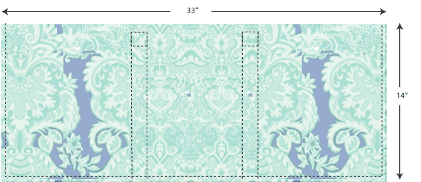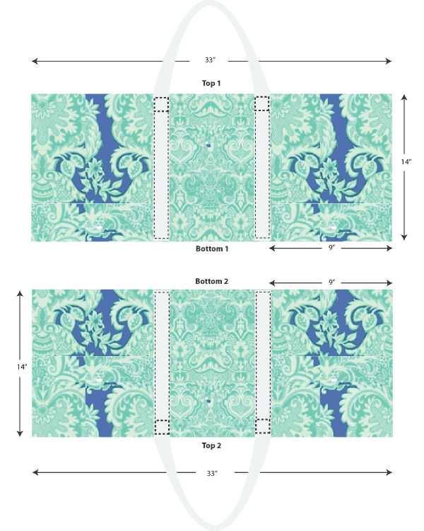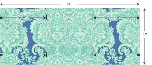 - From the exterior fabric, fussy cut TWO 33″ wide x 14″ high rectangles.