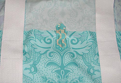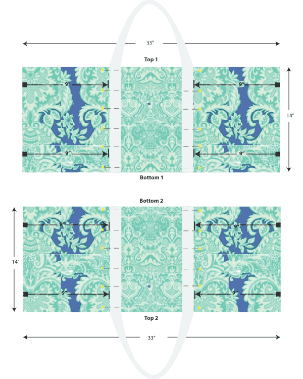 - To place the cotton webbing for the handles, first make four marks with your fabric pencil on the right side each exterior fabric 33″ x 14″ panel: 9″ in from each corner.