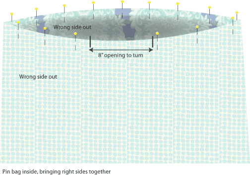 - Place the main bag inside the lining so the two layers are now right sides together. Pin around the top edge matching seams and centers and tucking the straps down (they should sit between the layers. Leave an 8″ opening for turning at the center back.