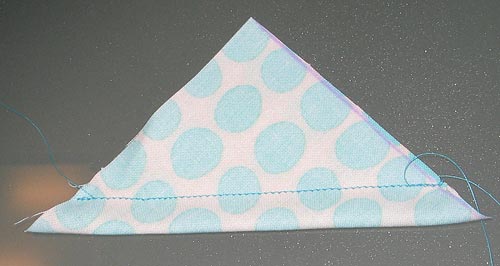 - Find the 4″ x 4″ square of lining fabric. Fold it in half diagonally, right sides together.