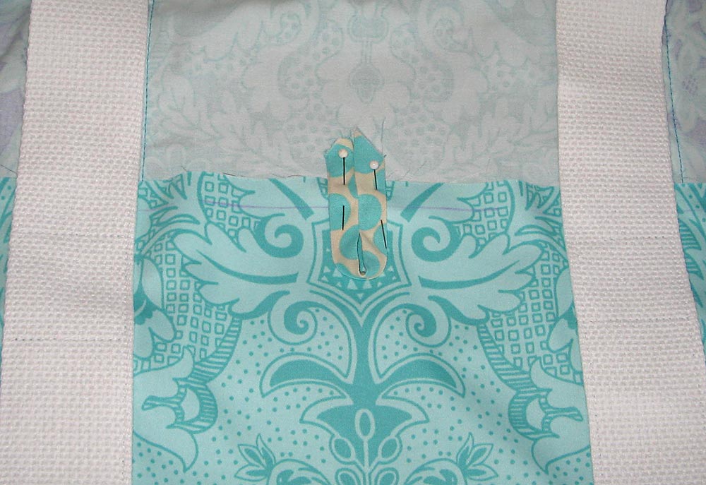 - Run straight up, make a 24″ loop to create the handle, then run the webbing back down the other side, lining up with your 9″ marks. Pin as you go.