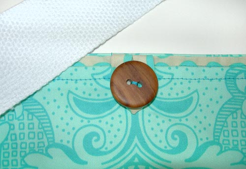 - Hand sew the wooden button to the center of the front of the bag, opposite the loop.