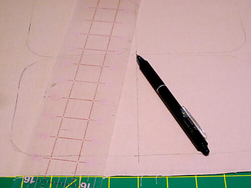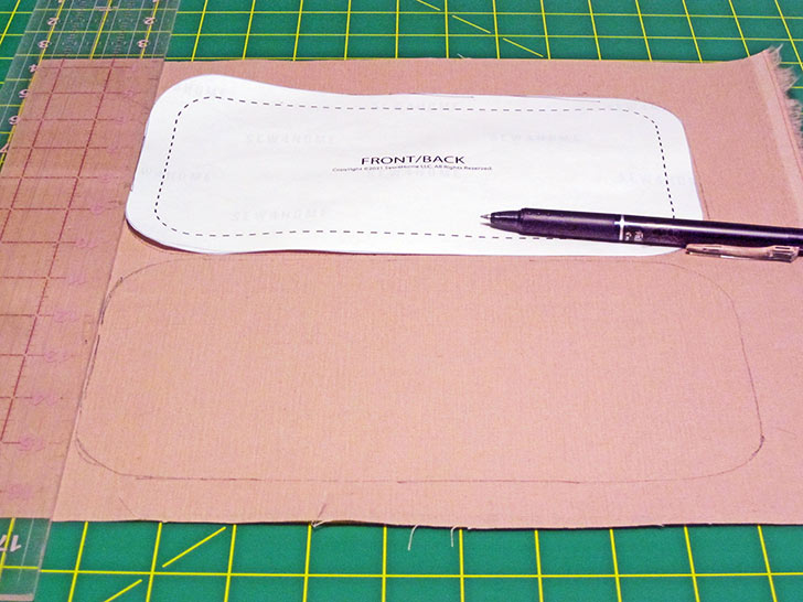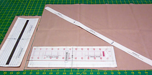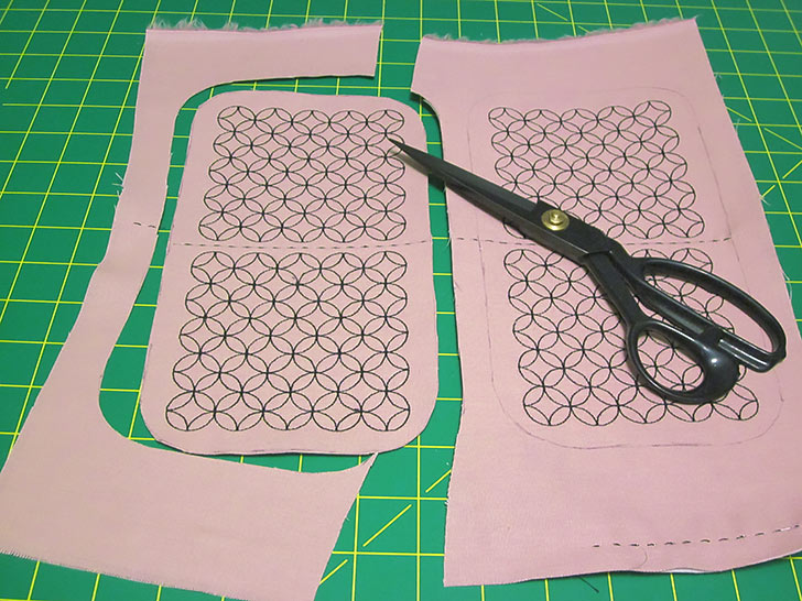 - Find the front/back pattern “frame” that resulted when you trimmed the pattern to cut the fusible fleece. You’ll use it here to confirm the final cut line for your front and back panels.
