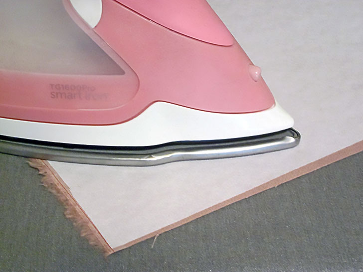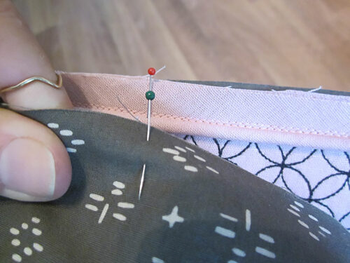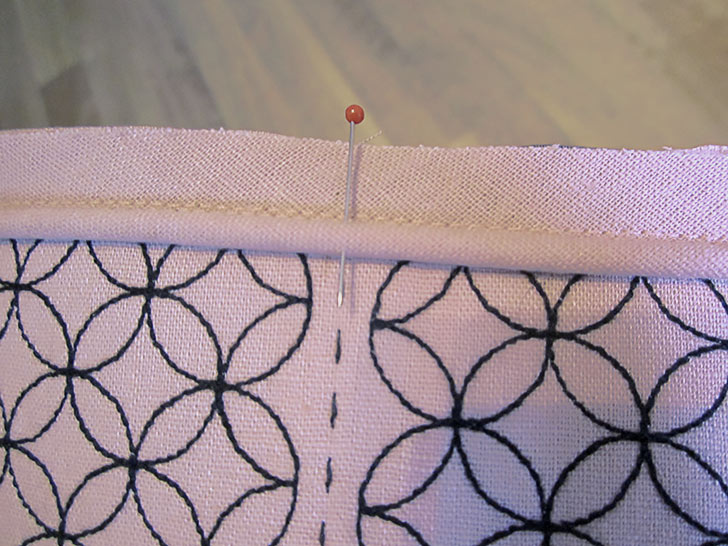- Find the double fold bias binding. Cut a length to fit around one complete panel seam allowance. Slip the binding over the seam allowance, encasing the raw edges to give the seam allowance a finished edge inside the pouch. Leave 1″ extra at the tail for an overlap. Pin in place all around… or simply slip the binding over the seam allowance and allow the presser foot to hold it in place. This option allows you to use your hand to stretch the binding slightly and wrap-as-you-go. A slight stretch or tautness to the binding can make it easier to curve around the corners.