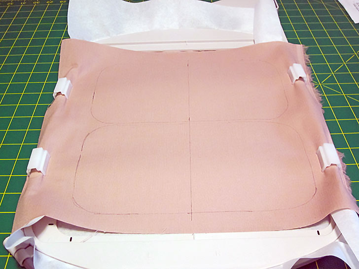 - Lay the marked panel on top of the hooped stabilizer, again centering top to bottom and side to side within the hoop. Align the drawn vertical line on the fabric with the top and bottom centering marks on the hoop itself.