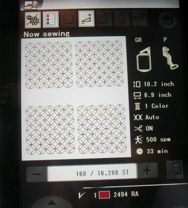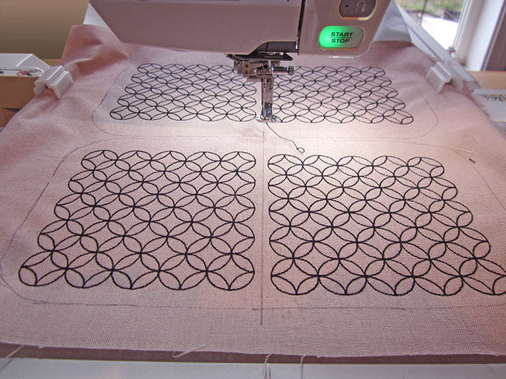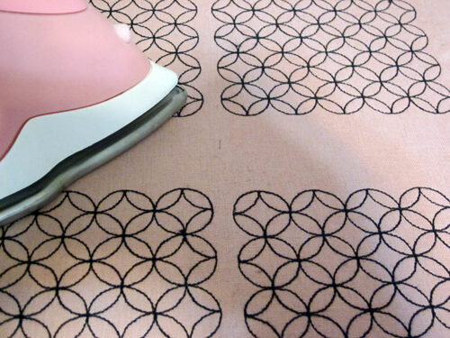 The pattern we chose for our case is called Shippo-Tsunagi or Seven Treasures. The geometric design combines four ellipses in a circle in such a way that the lines inside make more circles. The interlocking design is most often said to symbolize endless peace and happiness. This pattern is one of the 11 built-in Sashiko style designs on the Janome Horizon Quilt Maker Memory Craft 15000.