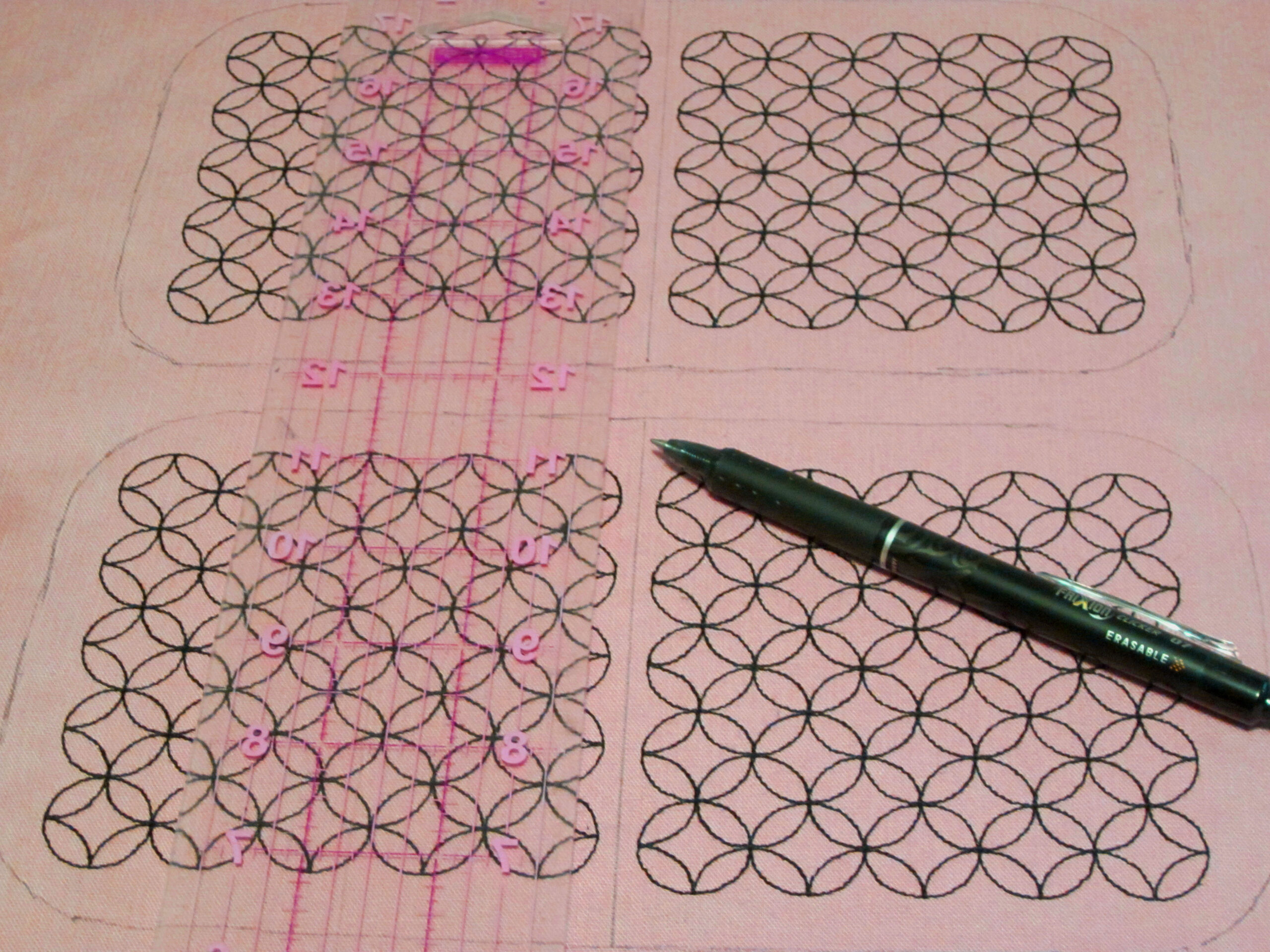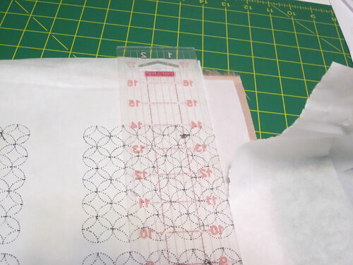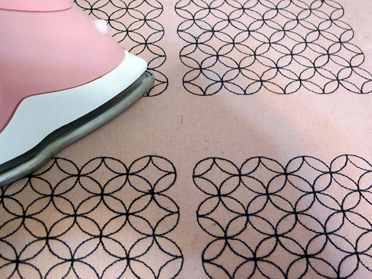 - When done, this re-positioning will yield a ¼” vertical space between each pair of designs – through which the Sashiko style straight stitching will run – and enough horizontal space between the upper and lower pairs to allow the panels to be to cut apart using the original paper pattern and maintaining the full ½” seam allowance.