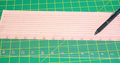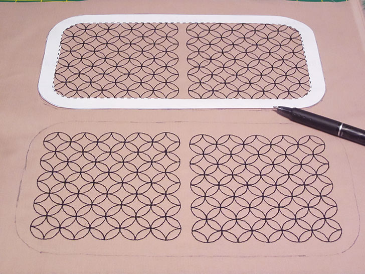 - With the perimeter lines drawn, find the exact center point between the pairs and draw a vertical guide line. The pairs of designs should be ¼” apart and this vertical line should go through the exact center from top to bottom. You will use this guide line for the Sashiko style straight stitching.