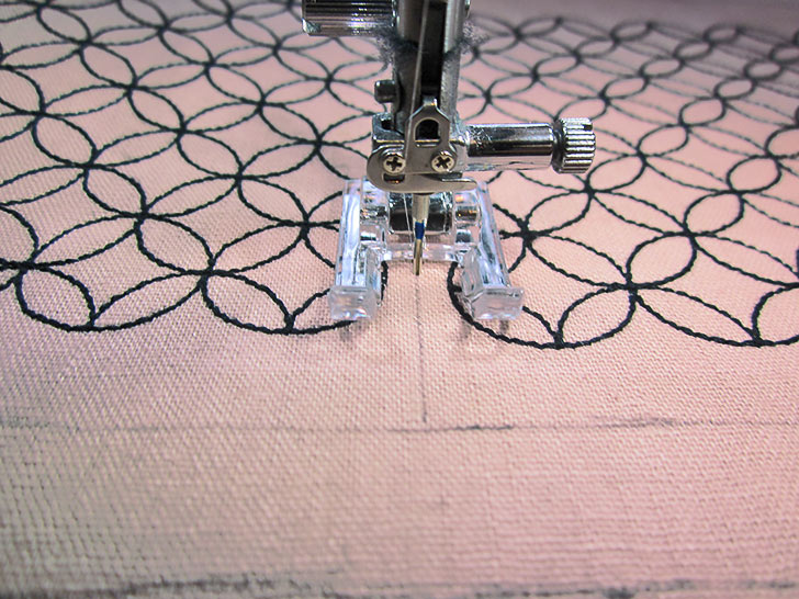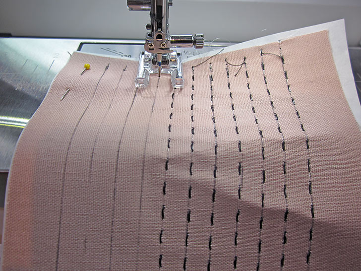 - Re-set the machine for Sashiko style straight stitching and stitch along each drawn line as you did above. This includes re-attaching the Satin Stitch foot.