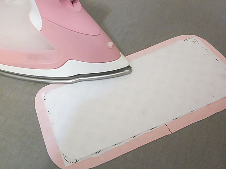 - As you did above with the front and back panels and the base panel, find the coordinating fusible fleece panel, slice it down the middle and center it on the wrong side of each stitched linen strip. Then, tear away the tear-away back to the fleece line all around.