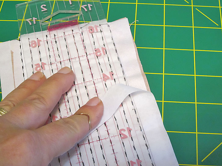 - Cut strips of the tear away stabilizer to fit beneath the linen strips to either side of the zipper. Lightly pin in place.