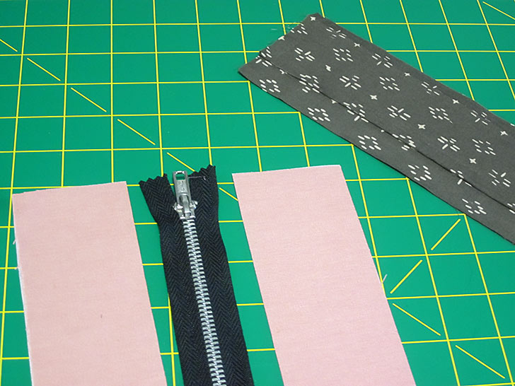 - Place one exterior strip right side up and flat on your work surface. Place the zipper right side down on top to the exterior strip. The zipper should be centered side to side and the edge of the zipper tape should be flush with the raw edge of the strip. Pin along the top of the zipper tape through both layers. Open the zipper about half way.