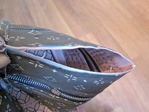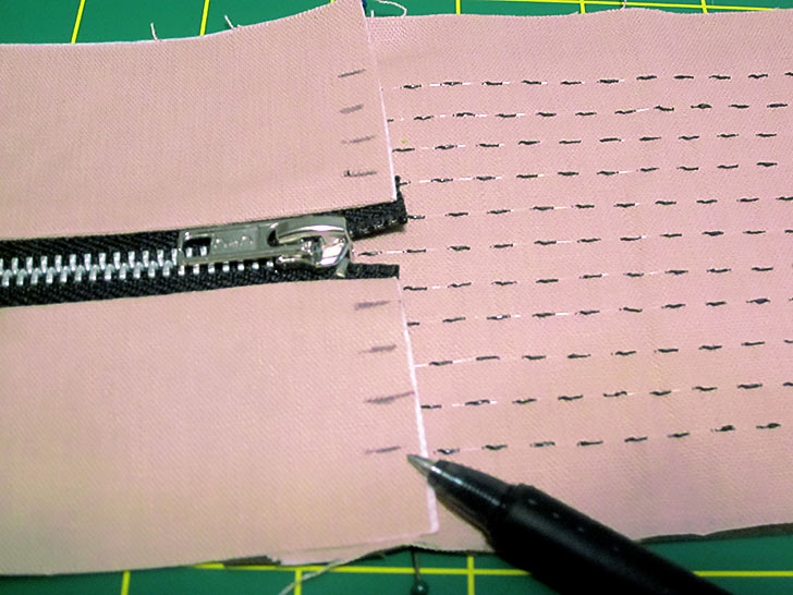 - Stitch along the original seam line through all the layers. As above, start with the zipper about half way open, then move the zipper pull as needed.