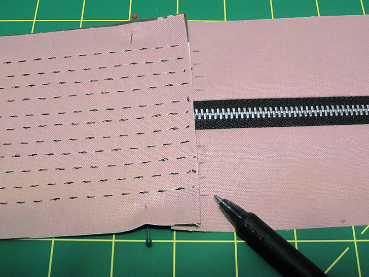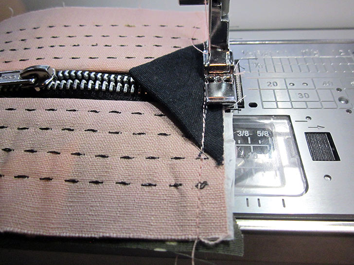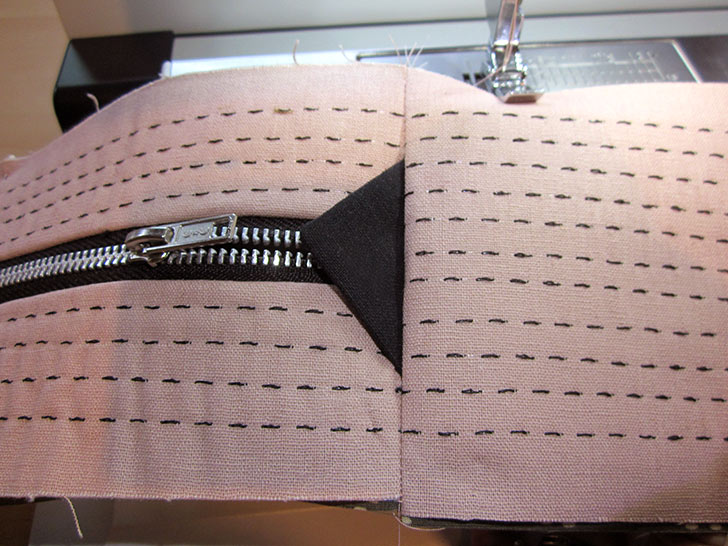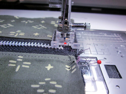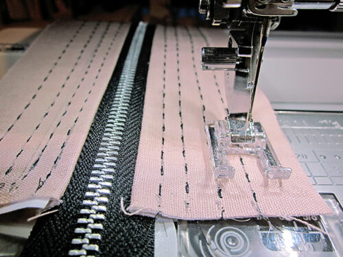 - Stitch all the lines on one side of the zipper, then re-position to stitch the opposite side, opening and closing the zipper as necessary to keep the pull out of the way.