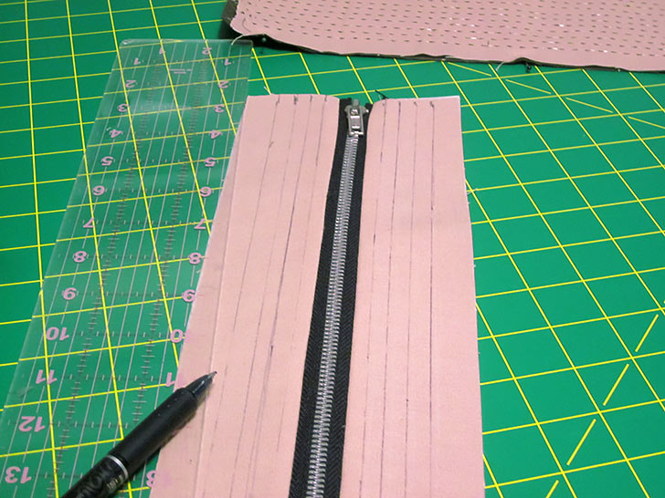 - Find your base panel, which should already have its pretty Sashiko style straight stitching finished. Align one end of base panel with one end of the zipper panel. Use the Sashiko style stitching on the base panel as your guide to mark the stitching lines on the zipper panel. There should be four guide lines to each side of the zipper.