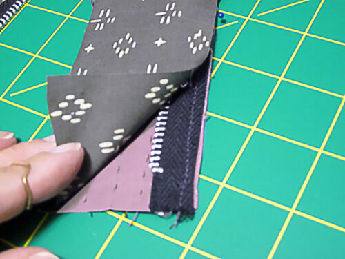 - With the “wings” of the zipper unit wrong sides together to either side (exterior and lining are wrong sides together to either side of the zipper), start with the zipper unit lining side up. Sweep just the exterior strip back under the zipper so the two exterior strips are right sides together, leaving just the one lining strip extending to the right.