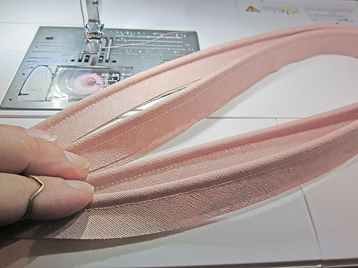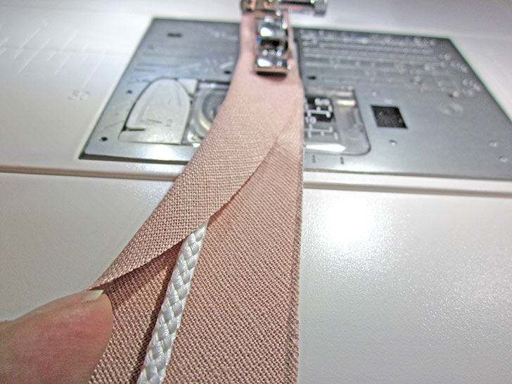 - Find the two 26½” bias strips and the two matching lengths of thin cording.