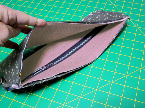 ONE MORE NOTE: The zipper pull tabs should be loose from the side of the pouch, which is what needs to happen so they can act as pulls to allow you to easily open and close the zipper. However, if you want them to sit more flat, you can use a hand needle and matching thread to very lightly tack them in the down position along the top of the triangle. Work from the inside of the pouch, hiding the stitch through just the back layer of each tab.