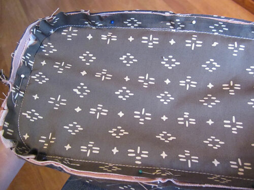 - Pin the piping on the right side of each exterior panel, aligning the raw edges of the piping with the raw edge of the panel and starting/ending at a center point of each panel. If necessary, you can clip the piping to better allow it to curve around the corners.