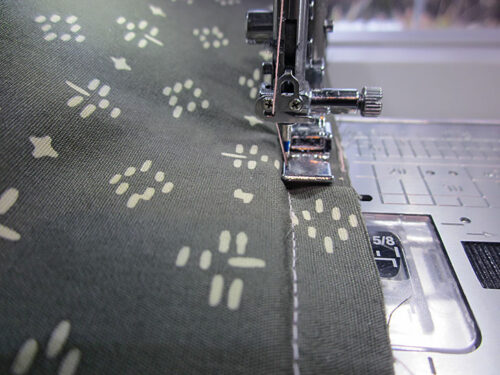 - Using an approximate ½” seam allowance, stitch the two short seams through all the layers. We say “approximate” because your goal is to stitch just beyond the zipper stops at the top and bottom, which might be slightly narrower or wider than ½”.