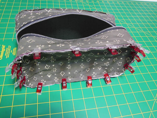 - This second panel will be a bit more challenging to wrangle under the presser foot because you no longer have an open side. However, by making sure the zipper is all the way open and working to flatten the layers, you should be able to go all the way around without a problem. As with all things that may present an initial challenge, go slowly and stop – with your needle in the down position – to adjust the layers as needed.
