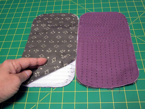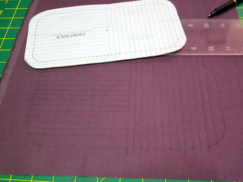 NOTE: If you are a pro at decorative stitching, you can simply draw in starting lines and use the edge of your presser foot or a quilting guide bar to keep each subsequent line parallel and evenly spaced. - If your front and back panel perimeter drawings are perfectly lined up on one top of the other, you can stitch continuous vertical lines of stitching from one panel to the other. Then, stitch the horizontal lines within each drawn perimeter. This is shown in our sample photo below, but it is optional and should only be done if you are absolutely confident the two panels are exactly aligned. If you’re unsure, stitch each panel independently.