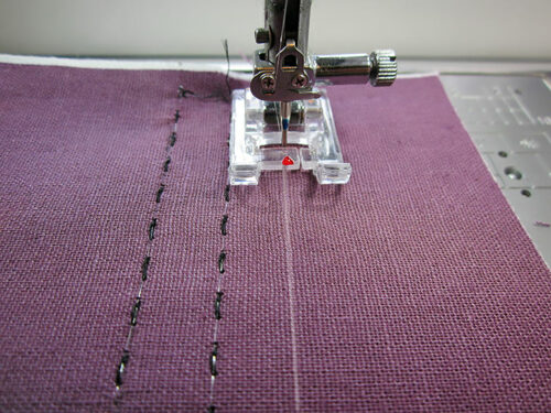 - You are still using construction thread to match the fabric in the top and bobbin and a standard straight stitch. We continued to use our Zipper foot for the best control. With a ½” seam allowance, stitch each tab in place.