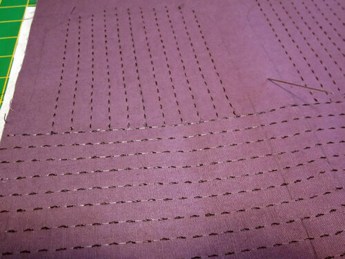 - Sashiko style stitching doesn’t look good with a traditional backstitch or locking stitch to secure the seam. The best way to avoid this is to simply stitch slightly beyond the drawn perimeter of the panel. When the panel is cut to size and all the pieces are sewn together, the Sashiko style stitching will be secured. However, this won’t work on the front and back panels where the horizontal lines run up against the first vertical line. In this instance, stitch each horizontal line should stop and not cross the vertical lines.