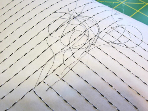- We recommend stitching the vertical lines first. Then, start each horizontal at the mid-point and stitch out to the edge of the panel. Start with long thread tails and take one stitch to pull up the bobbin thread. Hold the tails as you begin to stitch. When all the lines are finished, pull the tails through to the back with a hand needle and hand knot to secure. It’s okay to leave the thread tails long; they’ll be covered with the fusible fleece.