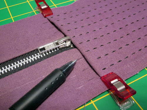 - Stitch along the original seam line through all the layers. As above, start with the zipper about half way open, then move the zipper pull as needed.