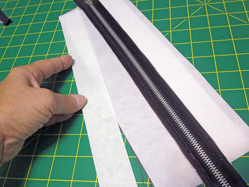 - Cut strips of the tear away stabilizer to fit beneath the linen strips to either side of the zipper.