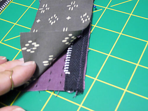 - Un-zip the zipper all the way. With the zipper unit right side up, fold one side the zipper unit – one stitched exterior strip – back over the zipper, revealing its original seam allowance.